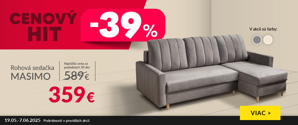 Rohová sedačka Masimo, béžová (látka BREEZE1), sivá (látka BREEZE15). Cena platí od 19.05.2025 do 7.06.2025 alebo do vyčerpania zásob, len v internetovom obchode www.agatanabytok.sk. Akcia nie je kombinovateľná s inými akciami. Pravidlá akcie a jej podrobnosti sú uvedené na www.agatanabytok.sk.