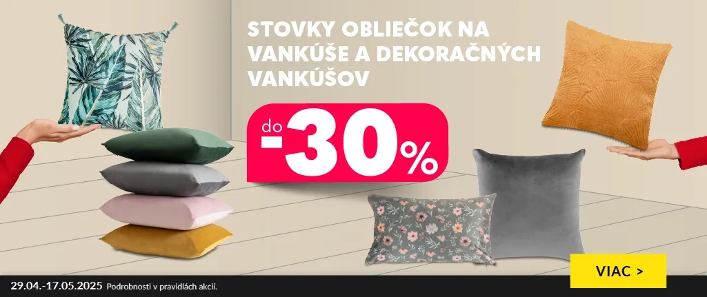 Akcia trvá od 29.04.2025 do 17.05.2025 a vzťahuje sa na vybrané obliečky na vankúše a dekoračné vankúše. Akcia nie je kombinovateľná s inými akciami a s výpredajovou ponukou. Akcia sa nevzťahuje na služby a platí len v internetovom obchode www.agatanabytok.sk. Pravidlá akcie a jej podrobnosti sú uvedené na www.agatanabytok.sk.