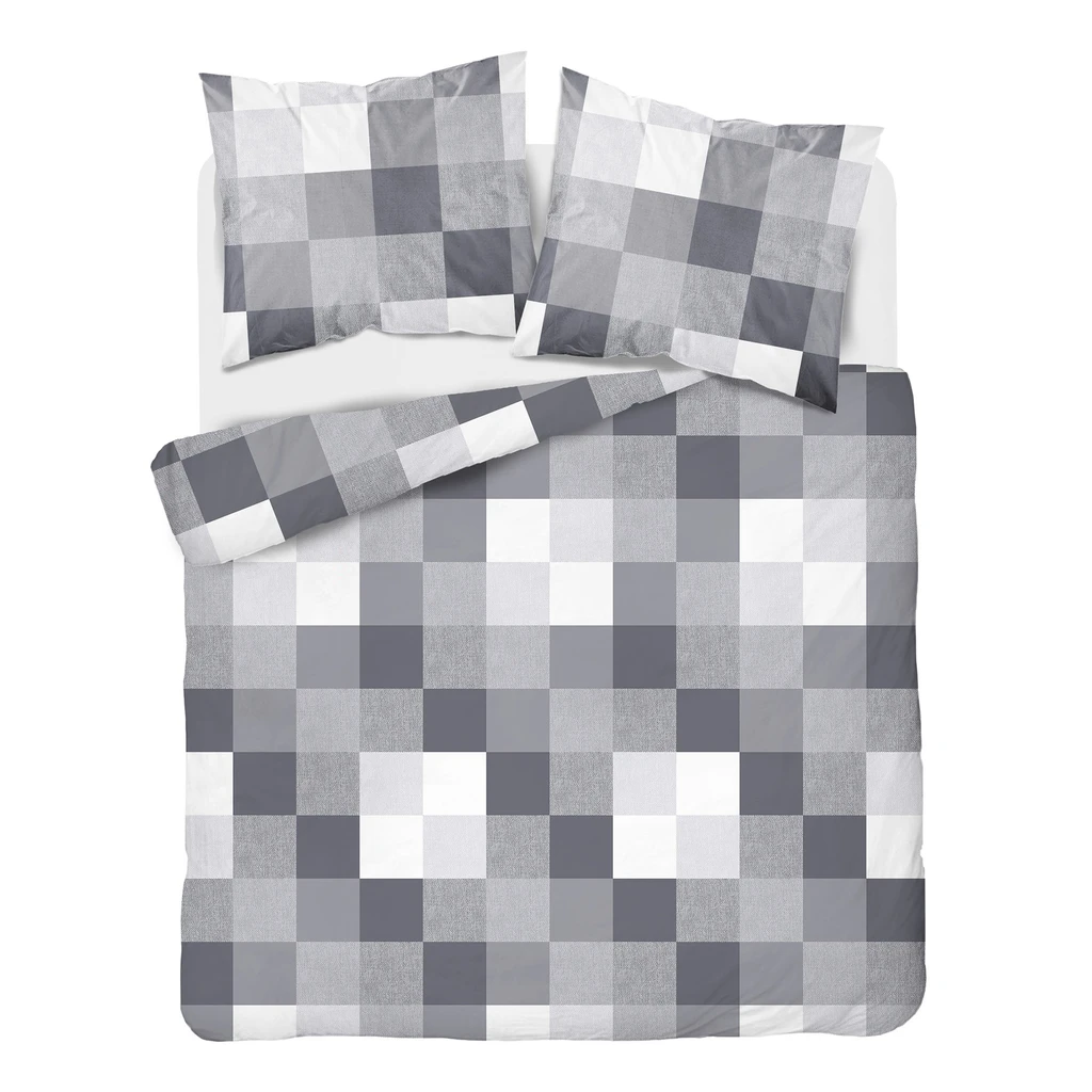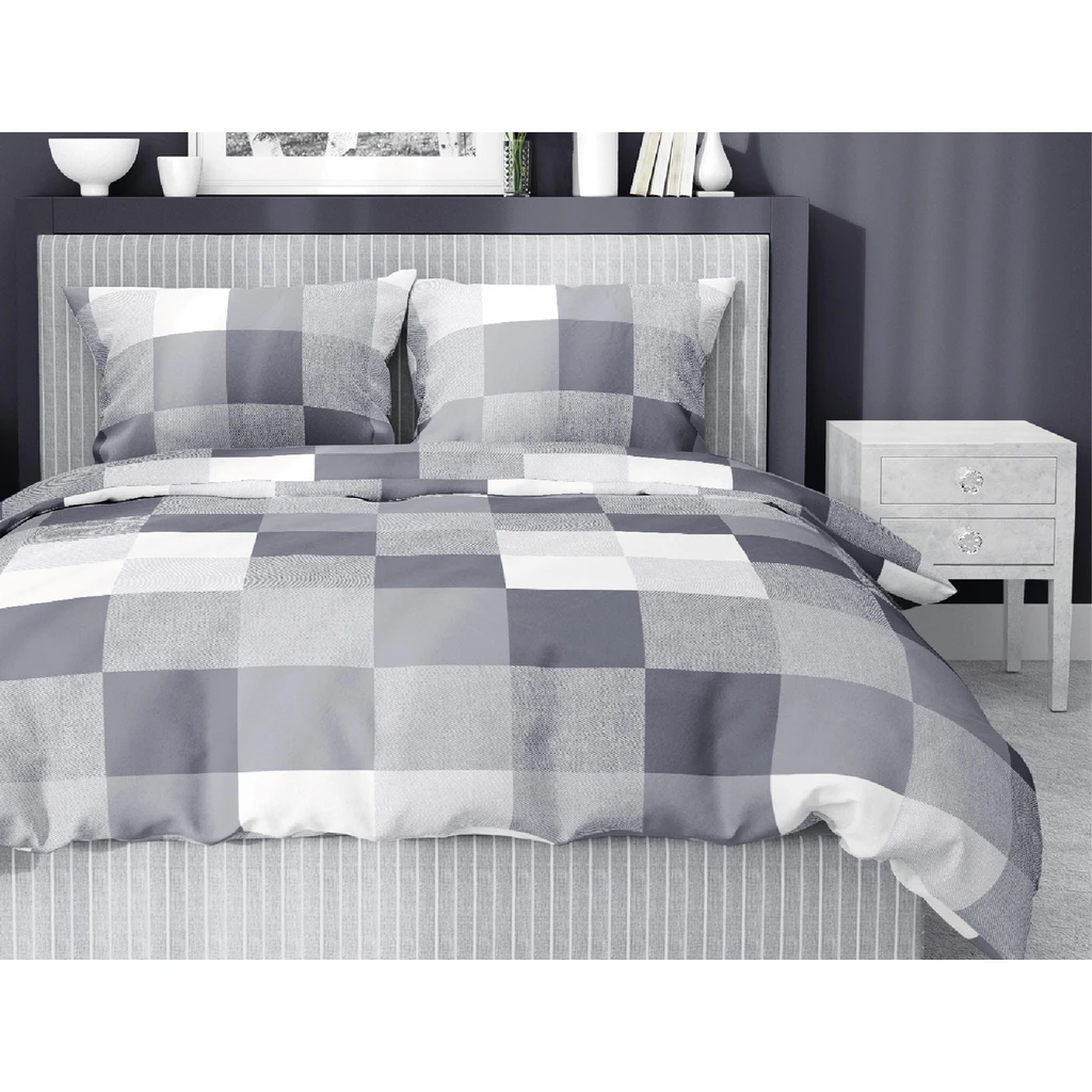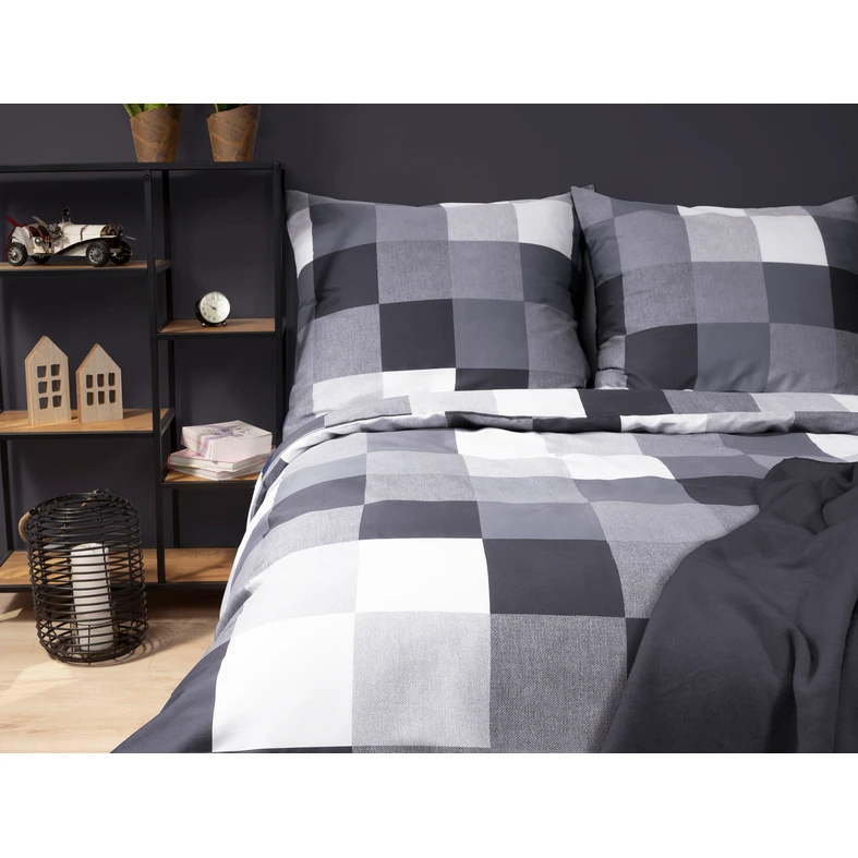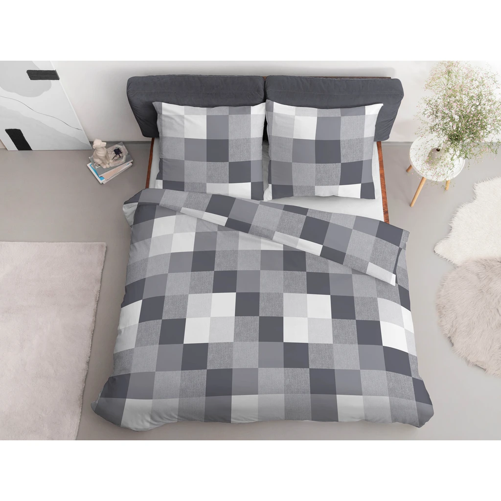 • Posteľná bielizeň má obojstrannú štvorcovú potlač v rôznych odtieňoch sivej.